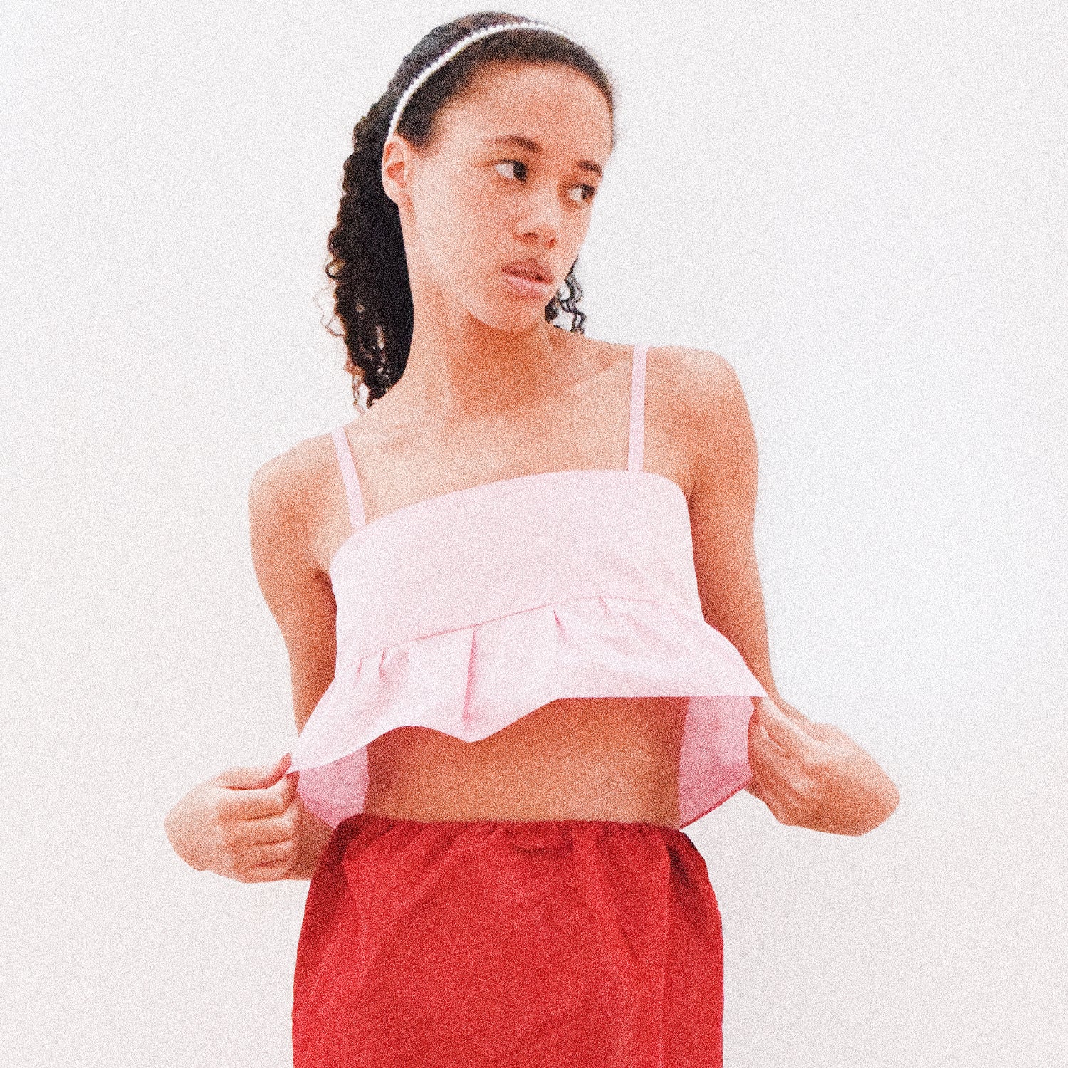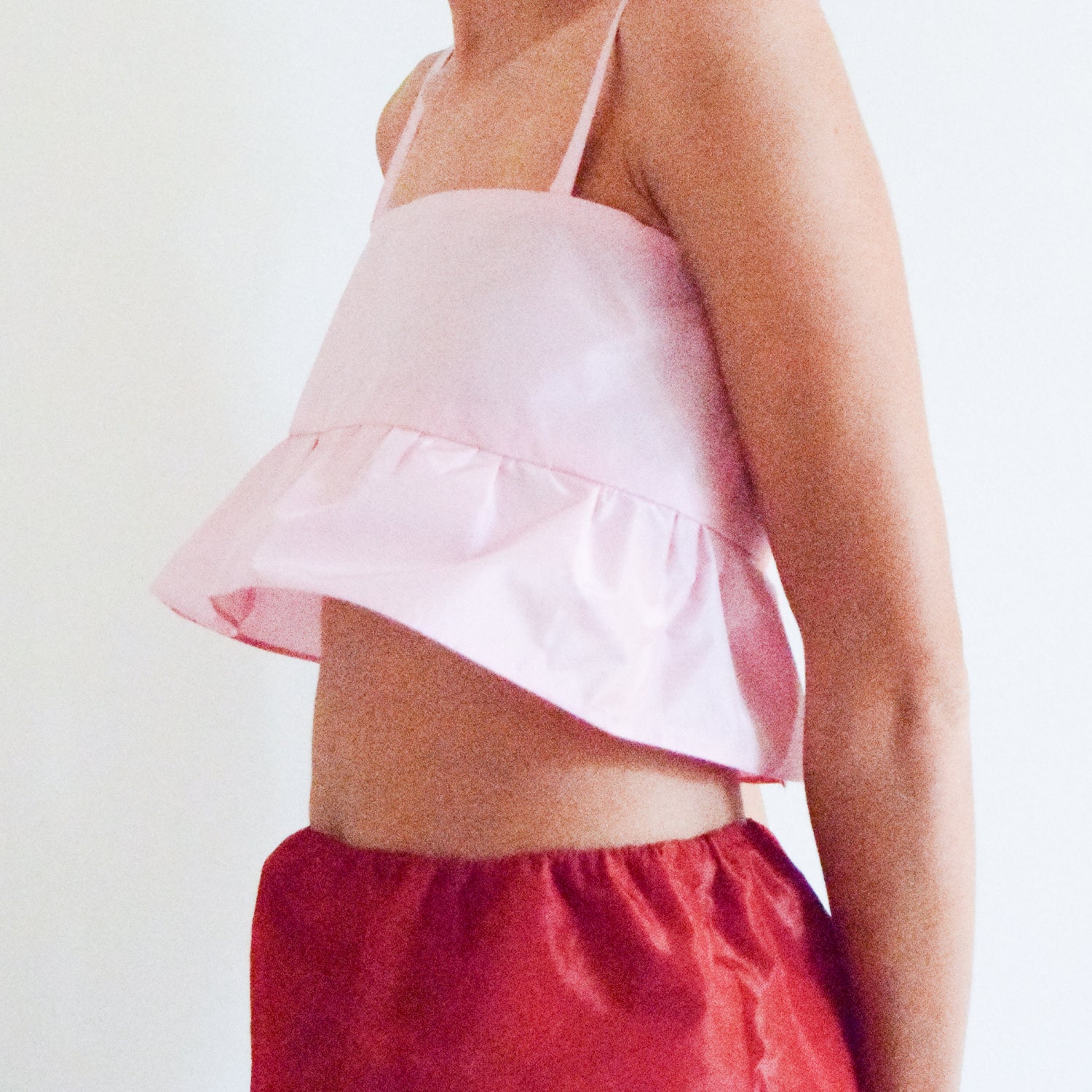 Ce haut en taffetas de soie rose poudré est un choix raffiné pour toutes les occasions. Avec son volant délicat, il ajoute une touche de féminité à n'importe quelle tenue. Conçu en taffetas de soie, il offre une texture luxueuse et légère pour vous garder confortable et élégante toute la journée.