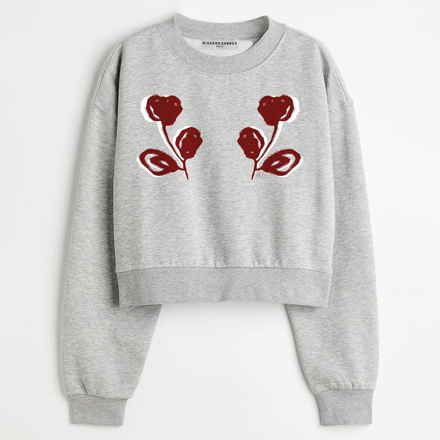 Le sweat-shirt coupe droite signé Ricardo Sanher est inspiré des vêtements de sport rétro des années 70. Il est orné de deux fleurs oversize imprimées et appliqués sur le devant. Réalisé en jersey de coton mélangé pour sa douceur, il présente un col au ras-du-cou côtelé.